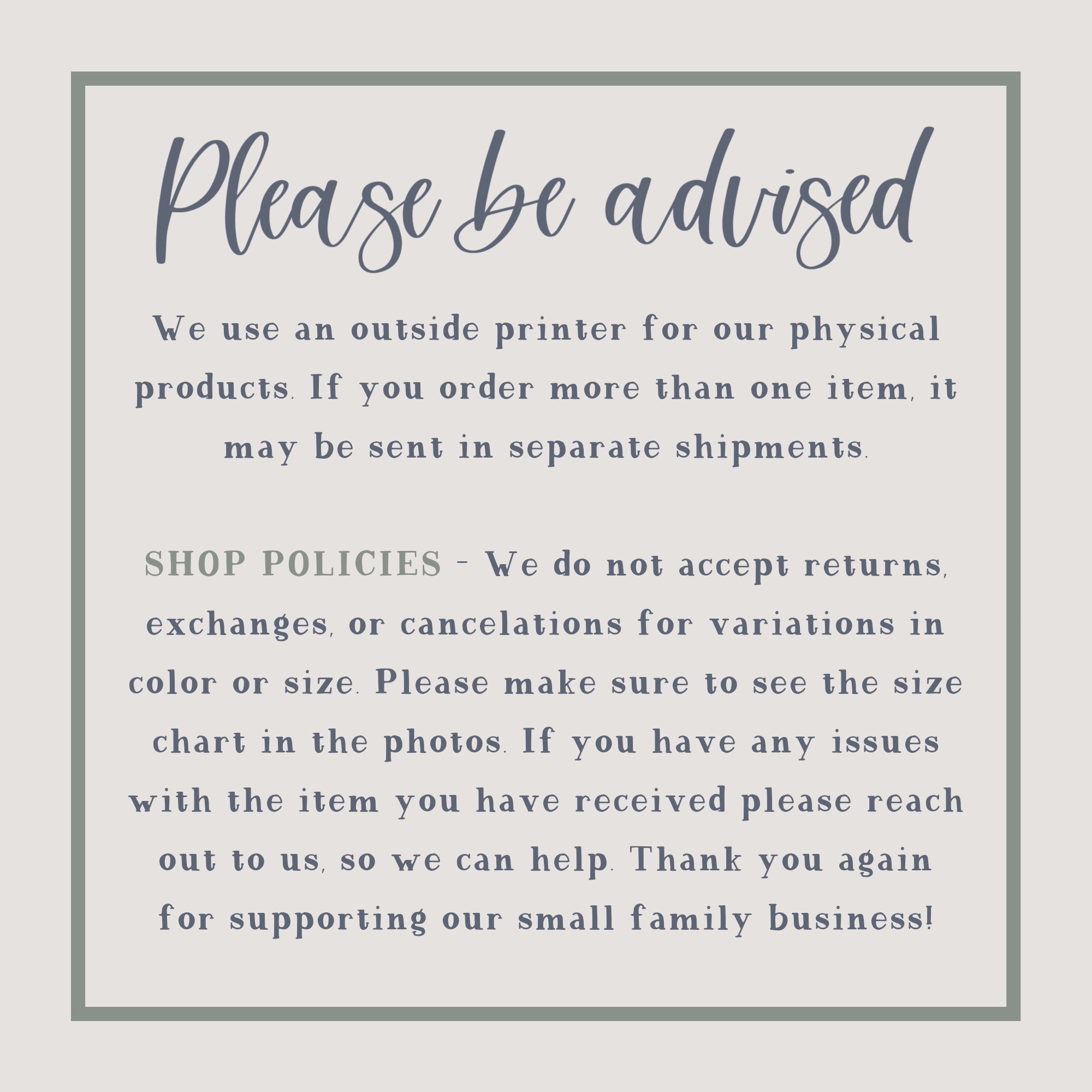 SHOP POLICIES - We do not accept returns, exchanges, or cancelations for variations in color or size. Colors may look slightly different than they appear once printed. Please make sure to see the size chart in the photos above. If you have any issues with the item you have received please reach out to us, so we can help. Thank you for supporting our small family business!